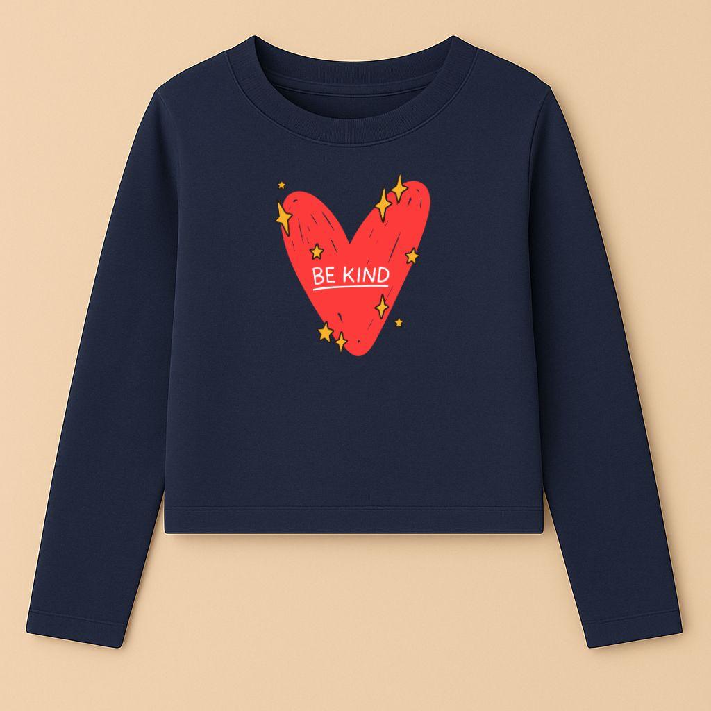 A navy long-sleeve cropped tee with a bright heart and star print — spreading a simple message that kindness always shines.
