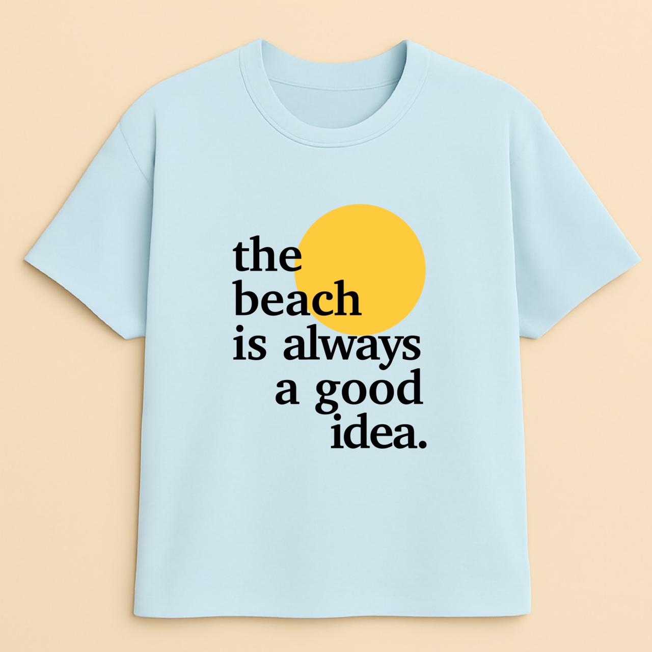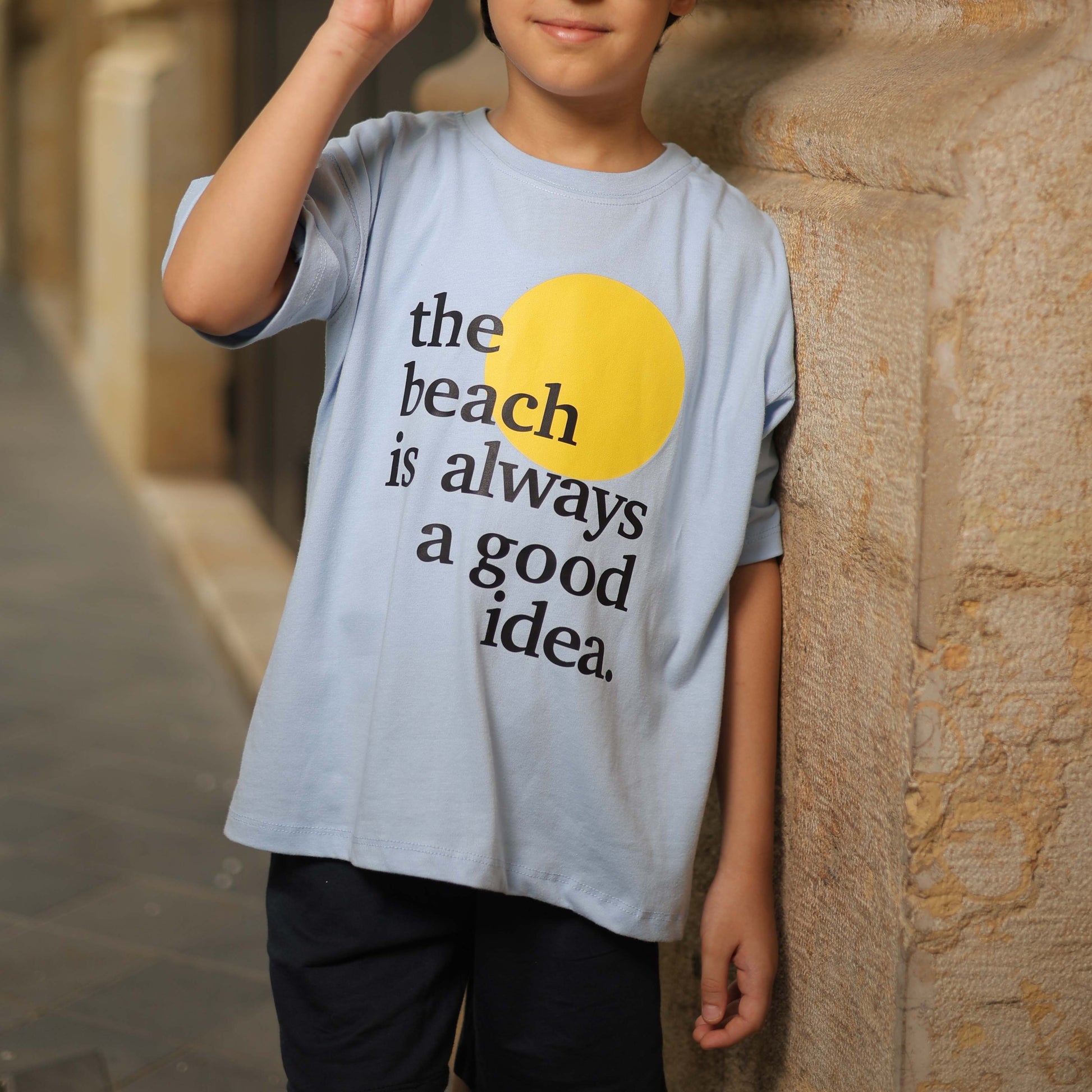 Soft blue tee with a fun reminder – the beach is always a good idea. Laid-back and full of sunshine spirit.
