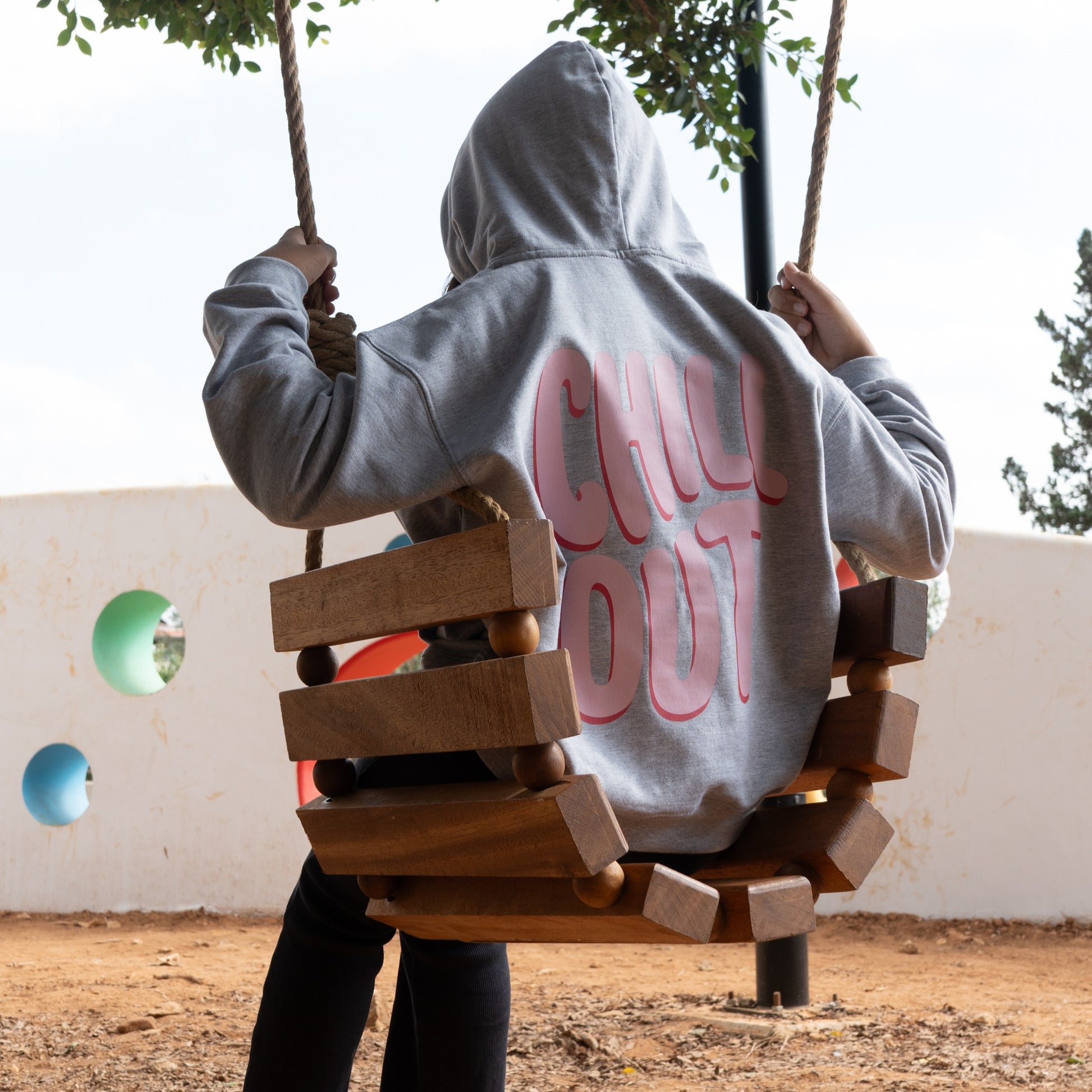 A light grey hoodie with bold pink bubble lettering — made for kids who know how to stay cool and comfy all day long.