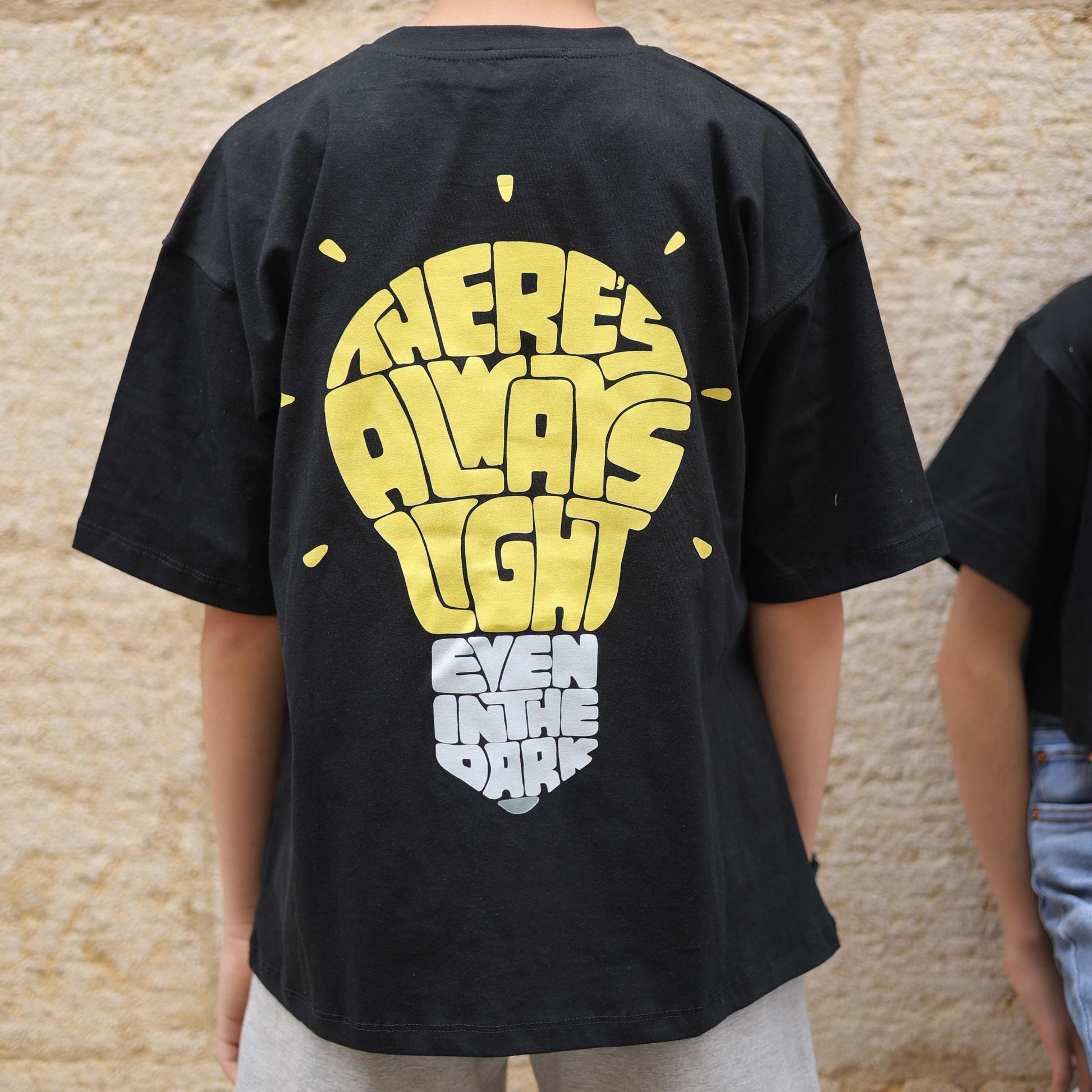 Black tee with a bright yellow lightbulb design reminding every kid: there's always light, even in the dark. Uplifting and bold.