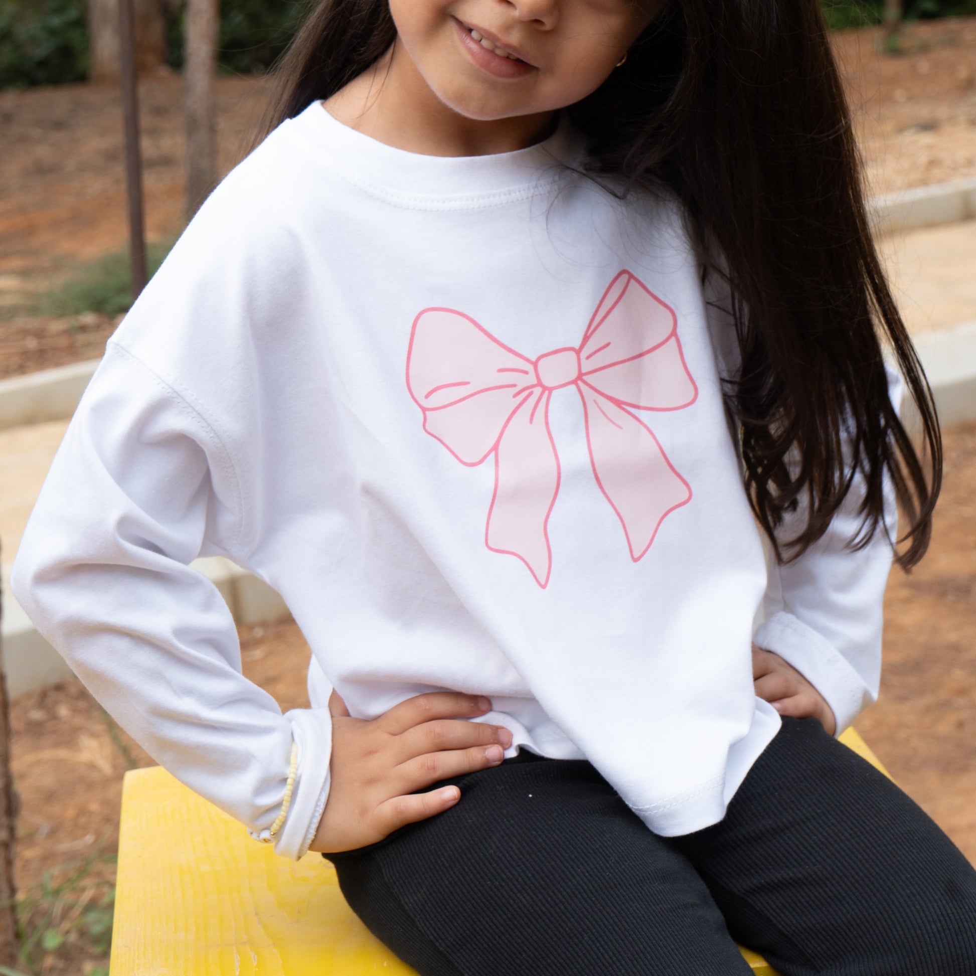A classic white long-sleeve cropped top featuring a soft pink bow — simple, sweet, and perfect for every little fashionista.