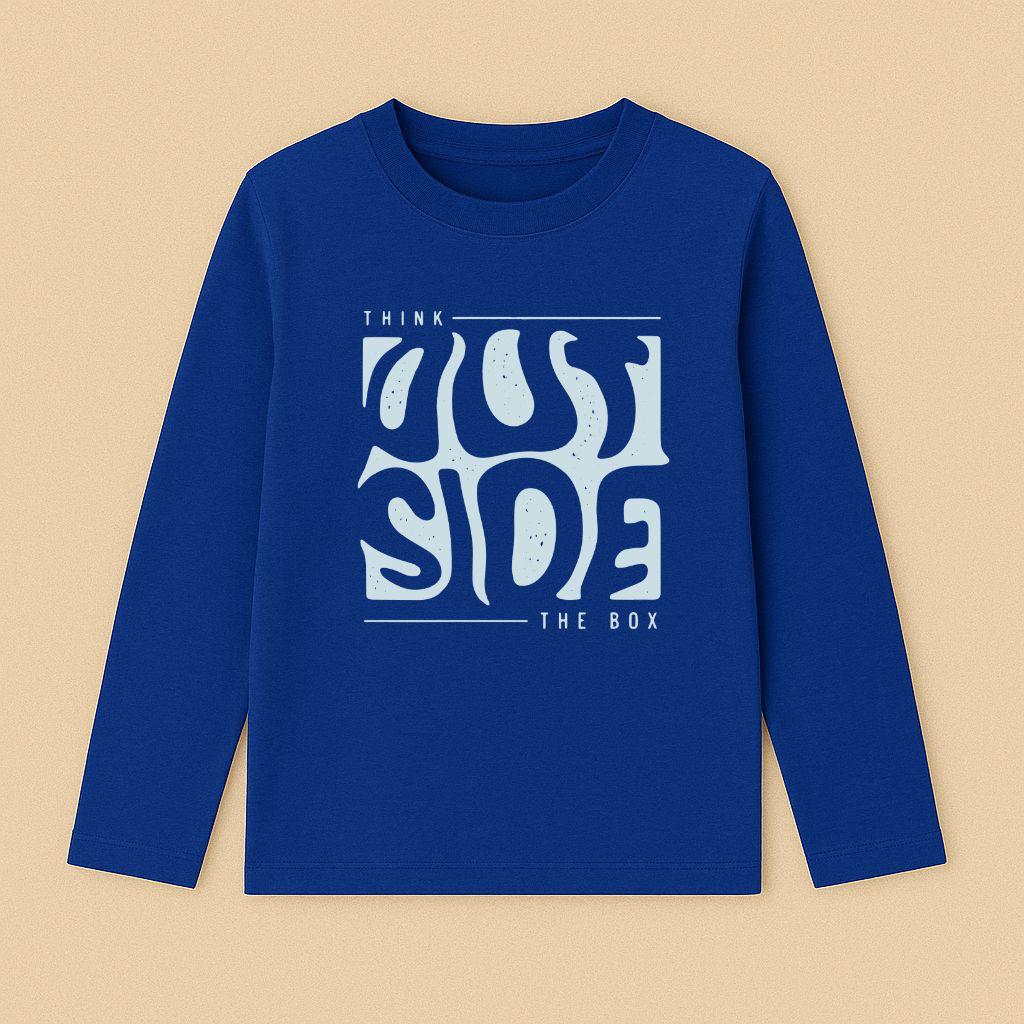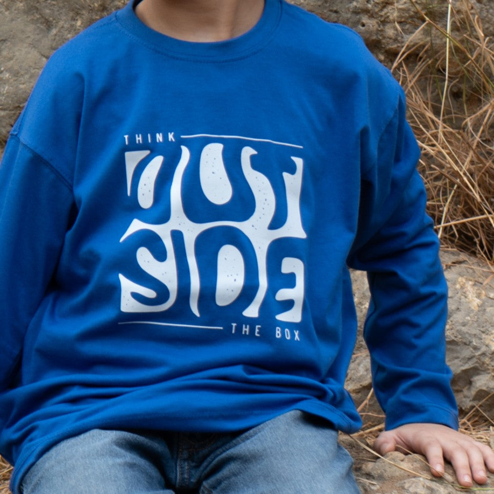 A bold blue long-sleeve with a playful “Think Outside the Box” print — perfect for dreamers who love to stand out and stay cozy.