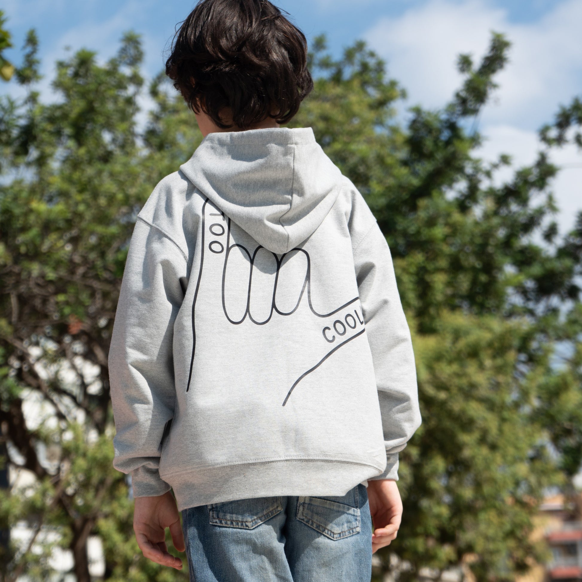 A light grey hoodie with a playful hand sign graphic reading “Too Cool!” — perfect for kids with confidence and chill vibes.