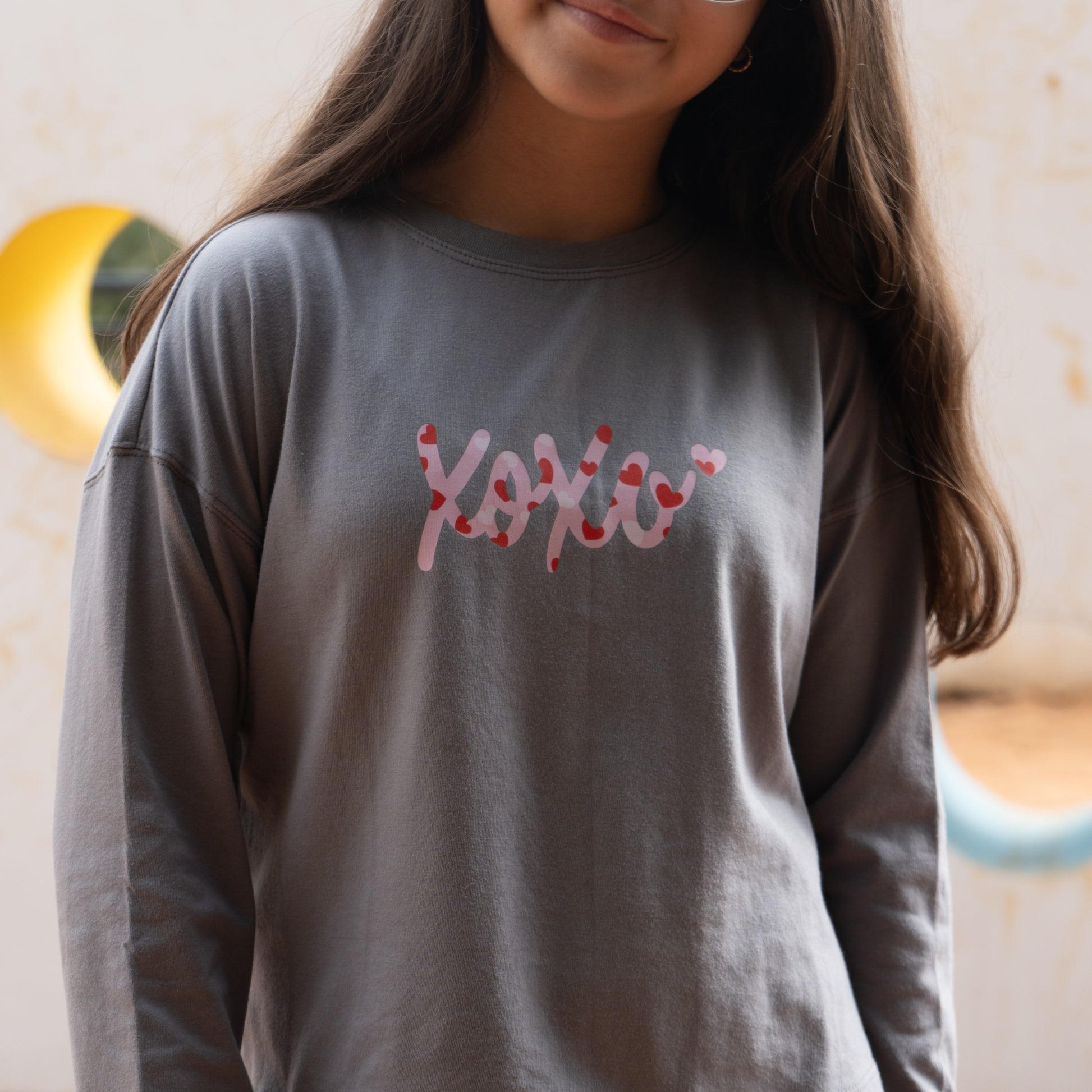 A dark grey cropped long-sleeve with a pink patterned “XOXO” print — the sweetest way to spread hugs, kisses, and cozy vibes.